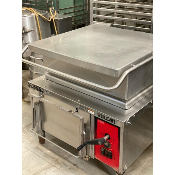 Front hinged polished stainless steel pan body with coved interior corners and embossed gallon markings. Stainless steel cooking surface bonded to steel plate. Full width 4" return flange with formed pouring lip and removable strainer